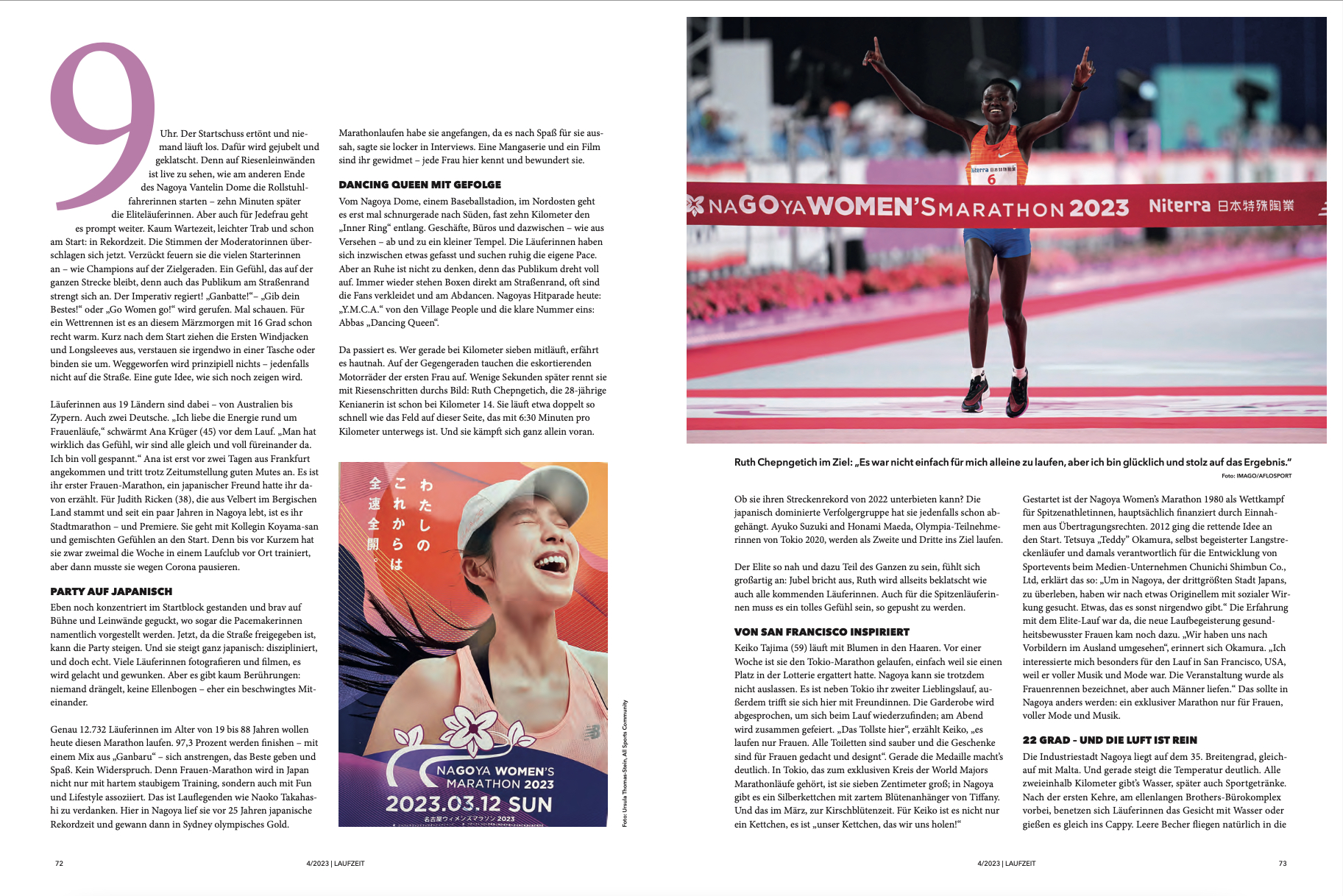 „Frauen unter sich“ ist gerade im Laufmagazin Laufzeit erschienen. Vielen Dank an Chef-Redakteur Christian Bruneß für das große Interesse am Frauenlaufsport, die gute Zusammenarbeit und den toll gestalteten Artikel. Danke an Laufpionierin Kathrine Switzer, die mich mit ihrem Hintergrundwissen zu den ersten Frauenläufen in Tokio unterstützt hat.