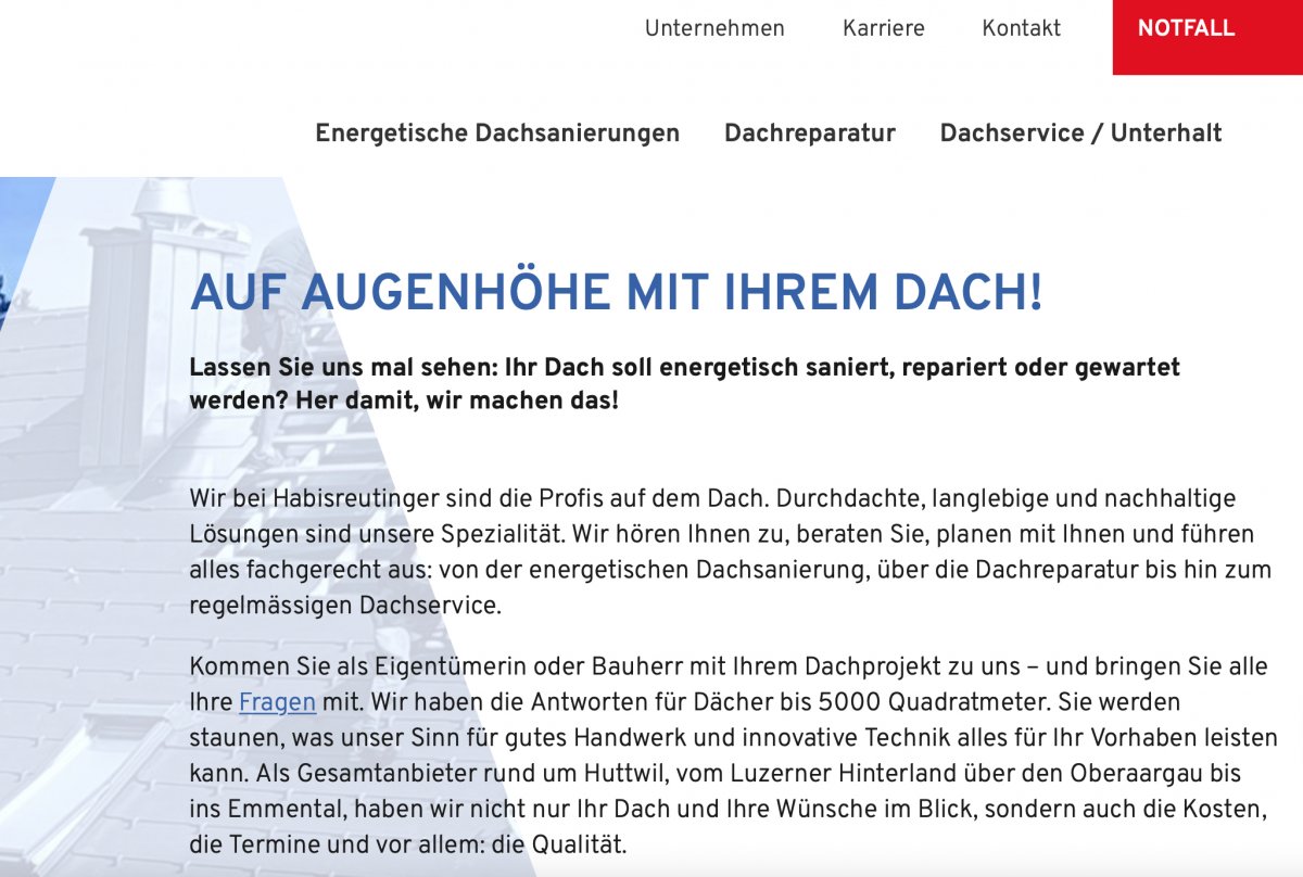 Website-Relaunch – mit Redesign, neuen Inhalten und natürlich SEO-Texten, die sich gut lesen. Im Briefing-Gespräch erklärt Ursi Meier vom Marketing Habisreutinger das Ziel des Projekts: „Der Kunde muss merken, dass er mit uns einen zuverlässigen Partner und Fachmann an seiner Seite hat, der sein Handwerk versteht und zusammen mit ihm die bestmögliche Lösung sucht.“ Welche Handlung soll denn bei der Zielgruppe ausgelöst werden? Klare Ansage: „Mit Habisreutinger will ich arbeiten – Habisreutinger soll mein Dach sanieren.“